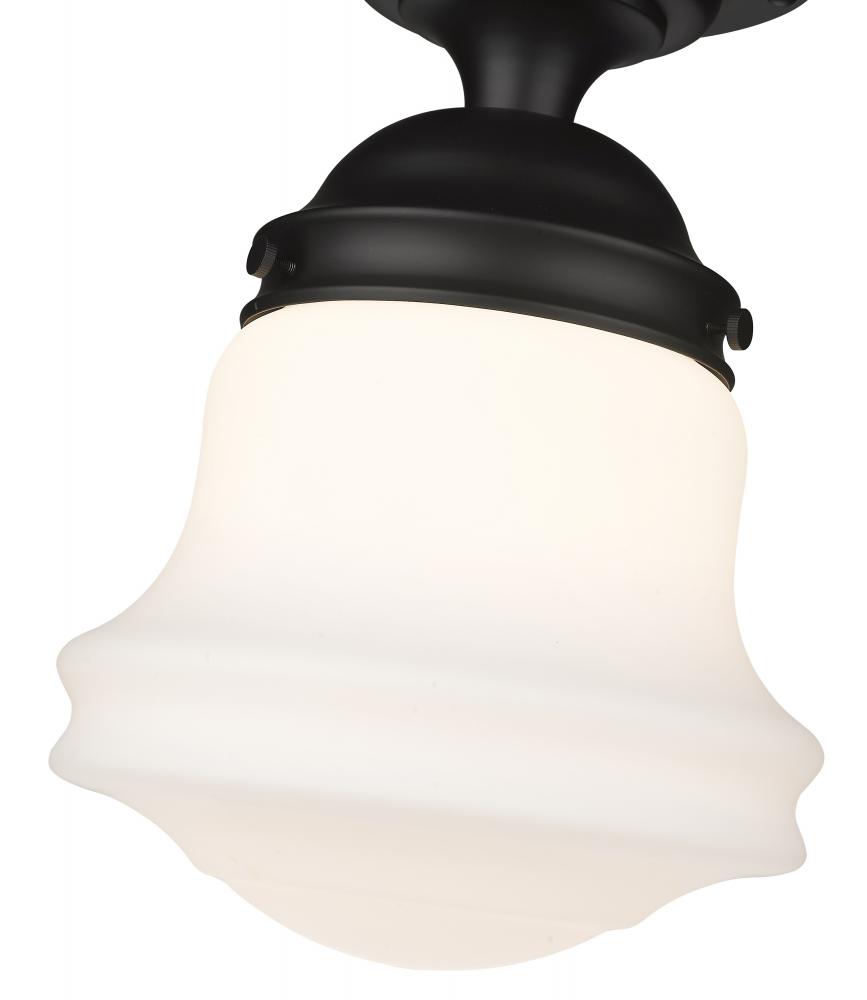 Elevate sophisticated classical interiors with the refined contoured silhouette and smooth surfaces of this restoration style flush mount. A matte opal glass bell shade rests tucked within a dramatically contrasted matte black steel mount detailed with rivet accents that lend an industrial schoolhouse-inspired aesthetic and modern farmhouse flair. This classical single light flush mount offers a serene glow, illuminating foyers, hallways and smaller spaces, as it offers a rustic metallic touch.