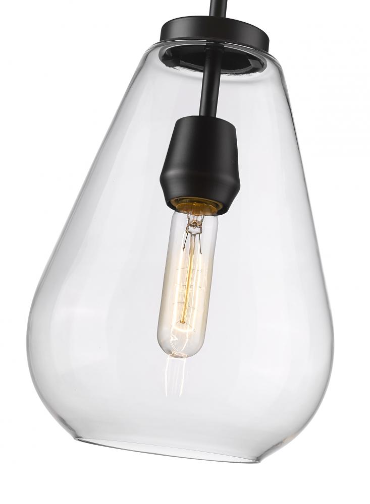 An eye-catching one-light pendant perfectly encapsulates the modern aesthetic. The tapered bell-shaped shade is made from clear glass, suspended from a steel frame with a sleek matte black finish. The fixture brings a chic cutting edge to a contemporary kitchen or dining room.