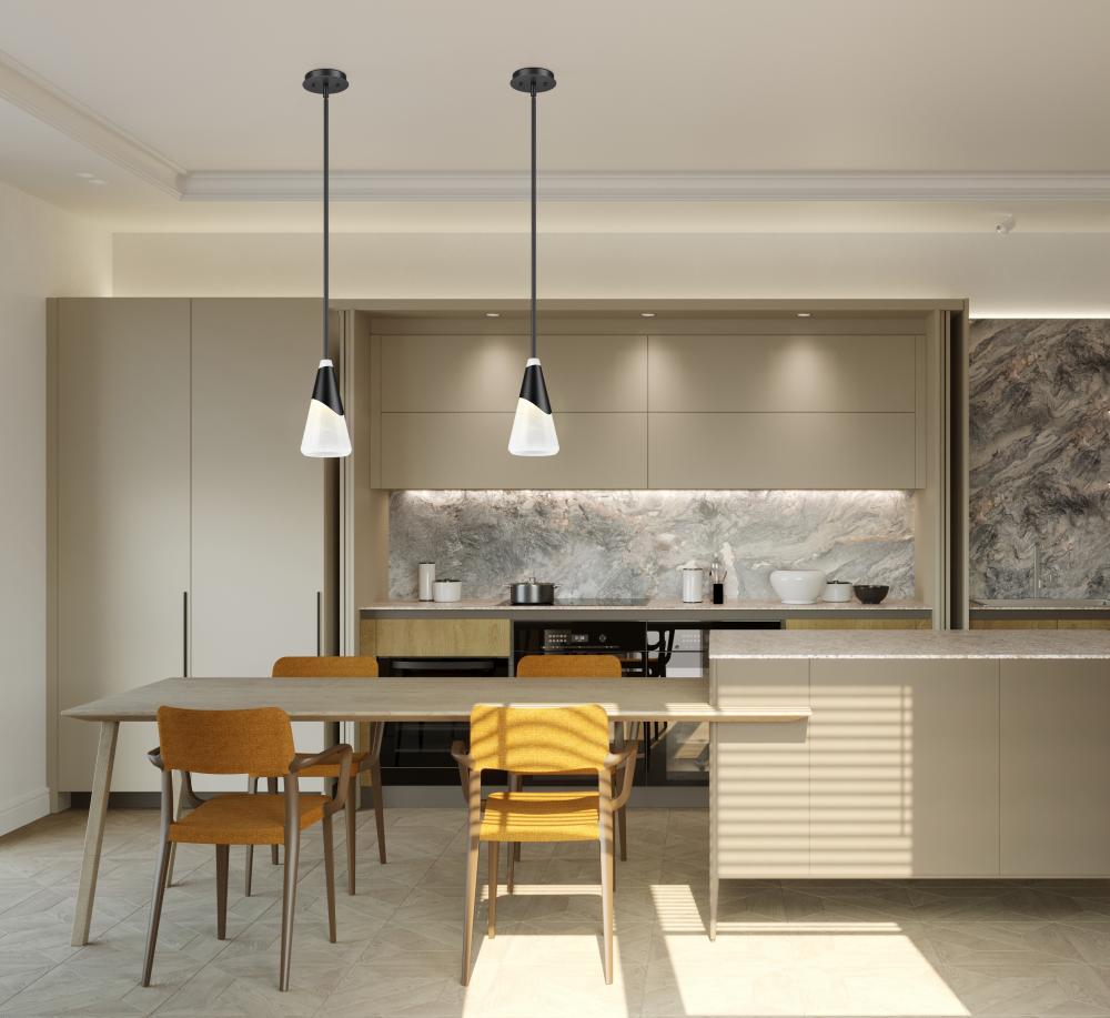 Capturing the natural beauty of melting ice, the Aimie collection boasts frosted artisanal glass in an abstract swirl pattern. A metal shroud encircles the glass shade, reducing glare while providing softly diffused light. Available in Matte Black, Brushed