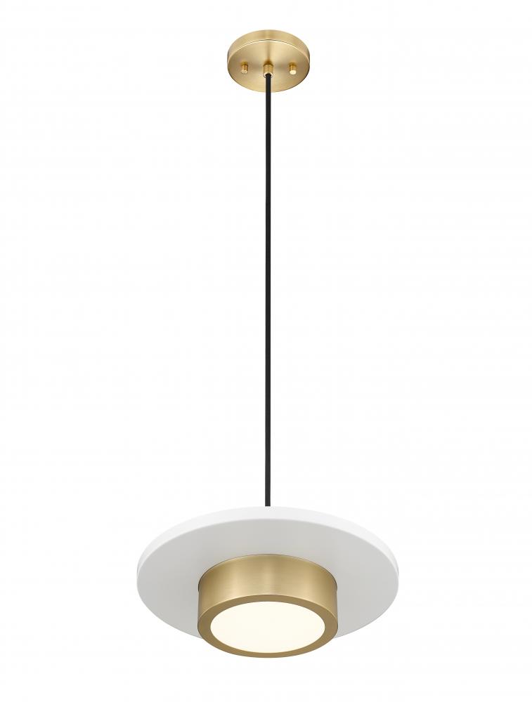 Keeping it simple, this art deco inspired one-light pendant leans on a geometric silhouette with cylinder shapes intersected by a matte white disc for good measure. Modern gold finish steel construction includes a round canopy, with a bold black suspension cord offering dimensional quality. Take advantage of dimmable LED illumination flowing through a frosted acrylic glass shade.