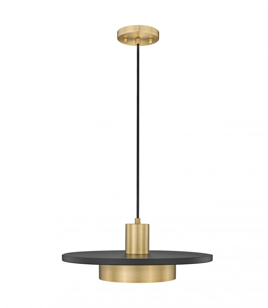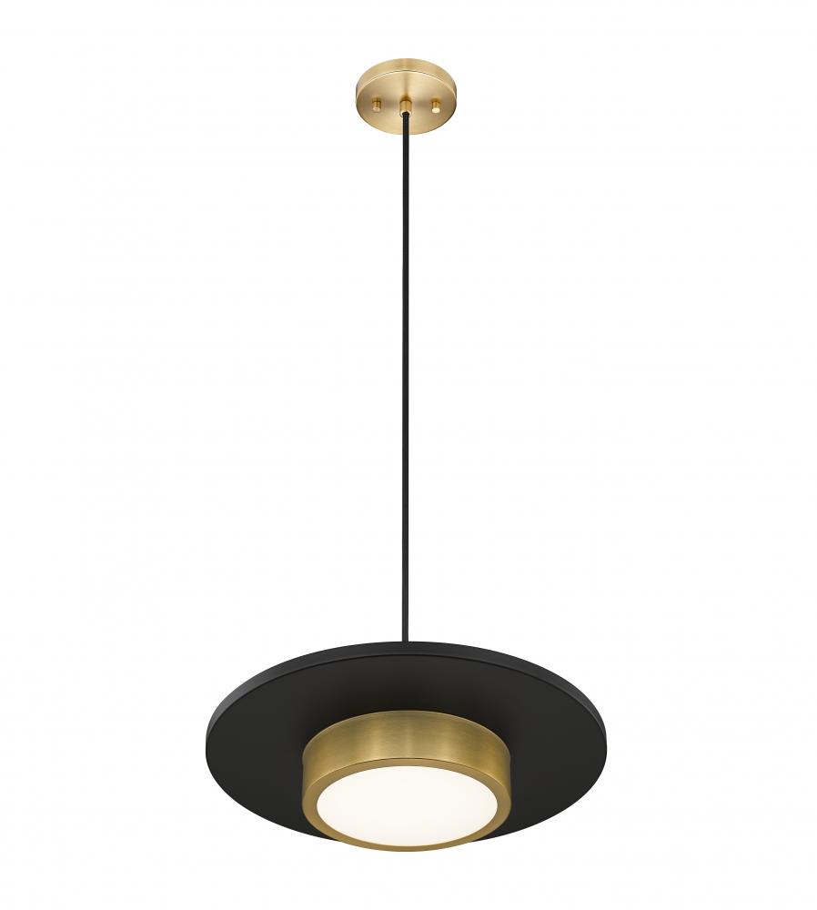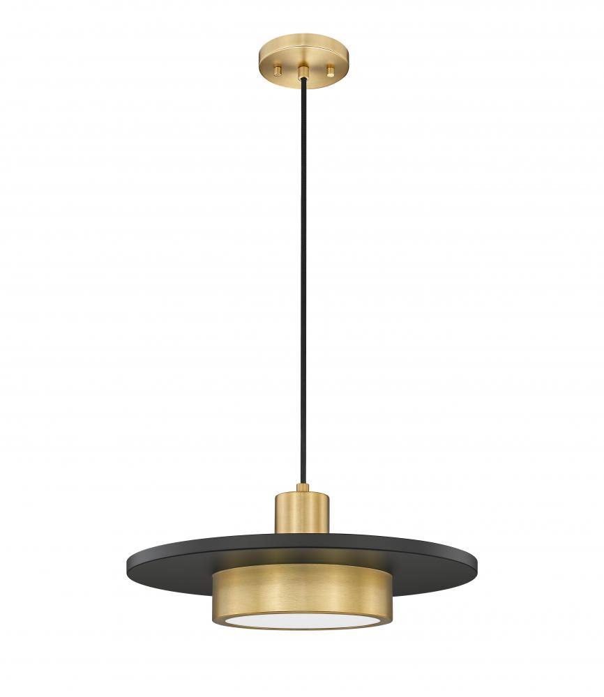 Repurpose an iconic palette and style with a single-light pendant that makes a statement in low-key spaces. This modern gold finish steel luminaire blends basic shapes including cylinders sandwiched by a matte black disc, eye-catching and refined. Dimmable LED lighting is perfect for mood lighting as it flows through a frosted acrylic shade.