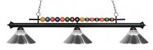 Playful pool ball motifs best describe this beautiful three light fixture. Finished in Brushed Nickel and paired with Clear Ribbed Glass and Metal Matte Black shades, this three light fixture would be at home in the game room. 72 inches of chain per side is included to ensure the perfect hanging height.
