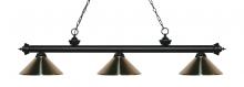 Elegant and traditional best describes this beautiful three light fixture. Finished in Matte Black and paired with satin gold shades, this three light fixture would be equally at home in the game room, or anywhere else in the house needing a touch of timeless charm.