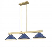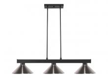 Straight line inspired detailing defines this beautiful three light fixture. Finished in matte black and paired with metal satin gold shades, this three light fixture would be equally at home in the game room, or anywhere else in the house needing a touch of modern charm. Adjustable rods are included to ensure the perfect hanging height.