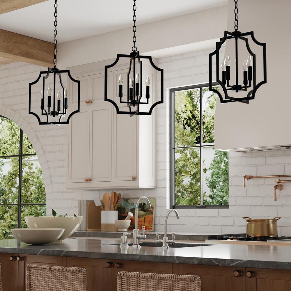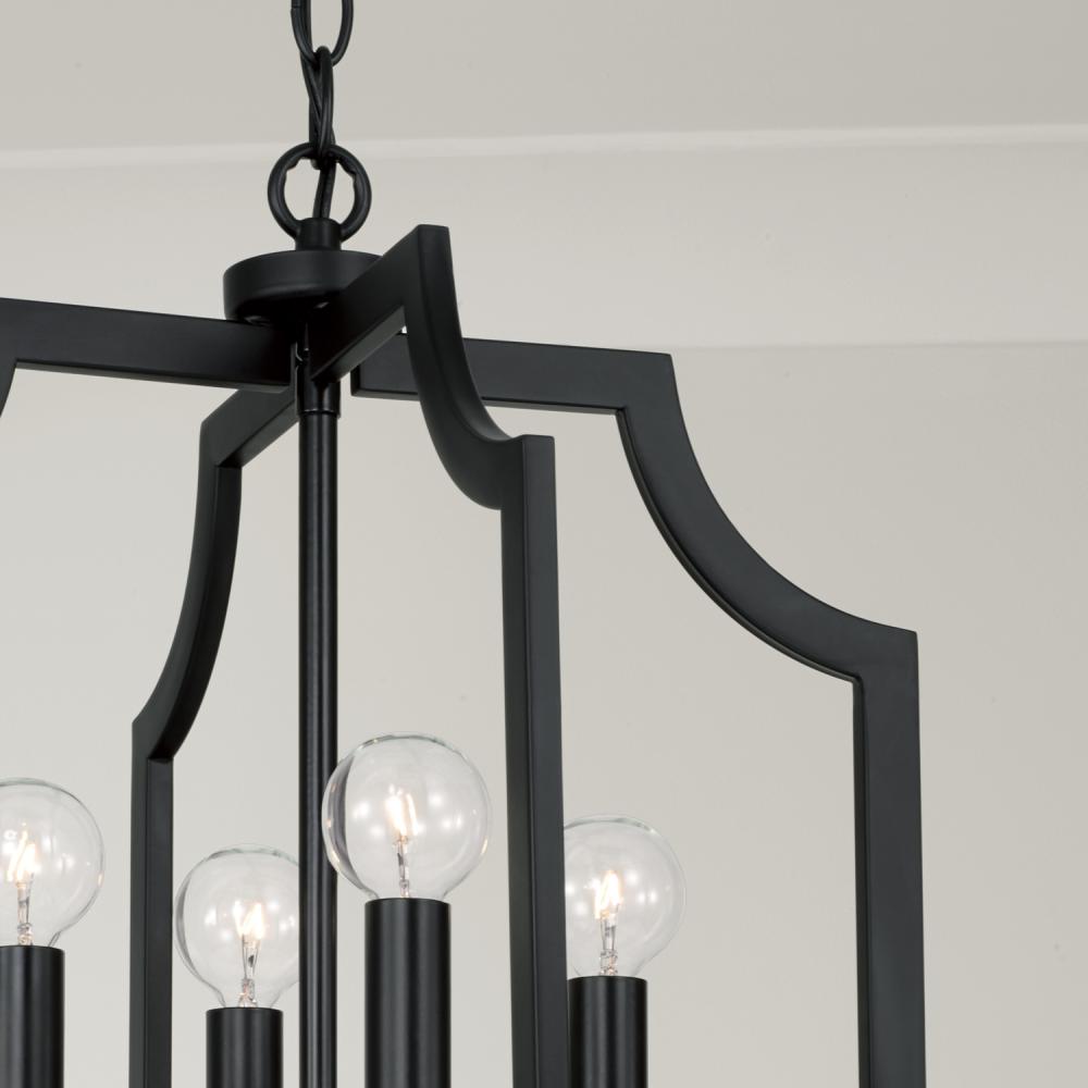 With the open, airy silhouette, the Courtney Lantern Foyer Pendant brings a charming aesthetic that doesn't overpower. The curved corners add chic appeal, while the Matte Black finish creates a bold, modern style.
