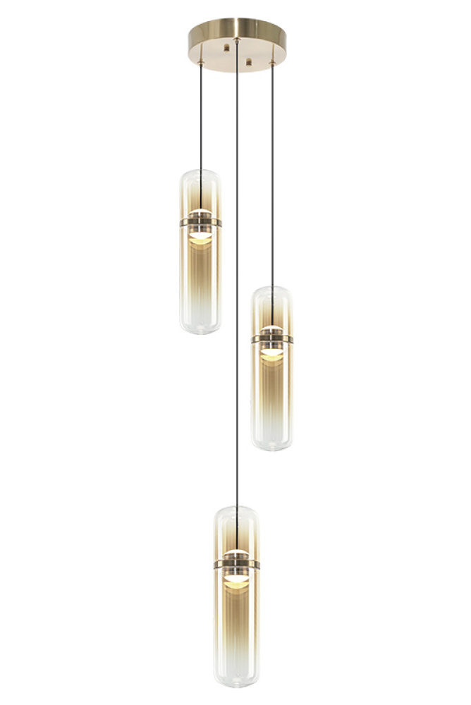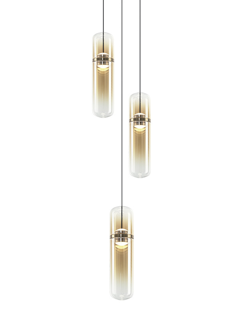 Amulet Sleek sophistication meets sculptural luminosity in this modern pendant series. Each elongated glass capsule features a softly tinted center that transitions to clear glass at the top and bottom, creating a refined gradient effect and warm, atmospheric glow. The Champagne Gold finish pairs with amber-tinted glass, while the Matte Black finish pairs with smoked-tinted glass, each offering a distinct and contemporary expression. Suspended from a coordinating canopy, the pendants float gracefully, adding movement and visual interest to any space. Features a 5CCT switch inside the canopy to adjust the 5 selectable colour temperature