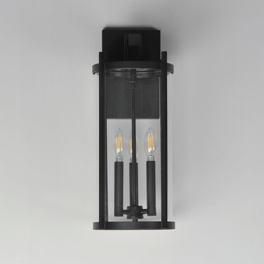 Squared columns in Matte Black finish tower above the cylindrical glass shade rated for outdoor applications. Available in a more modern clear glass option or hammered glass. A rectangular hook detail carries the square form through to the backplate. A mod