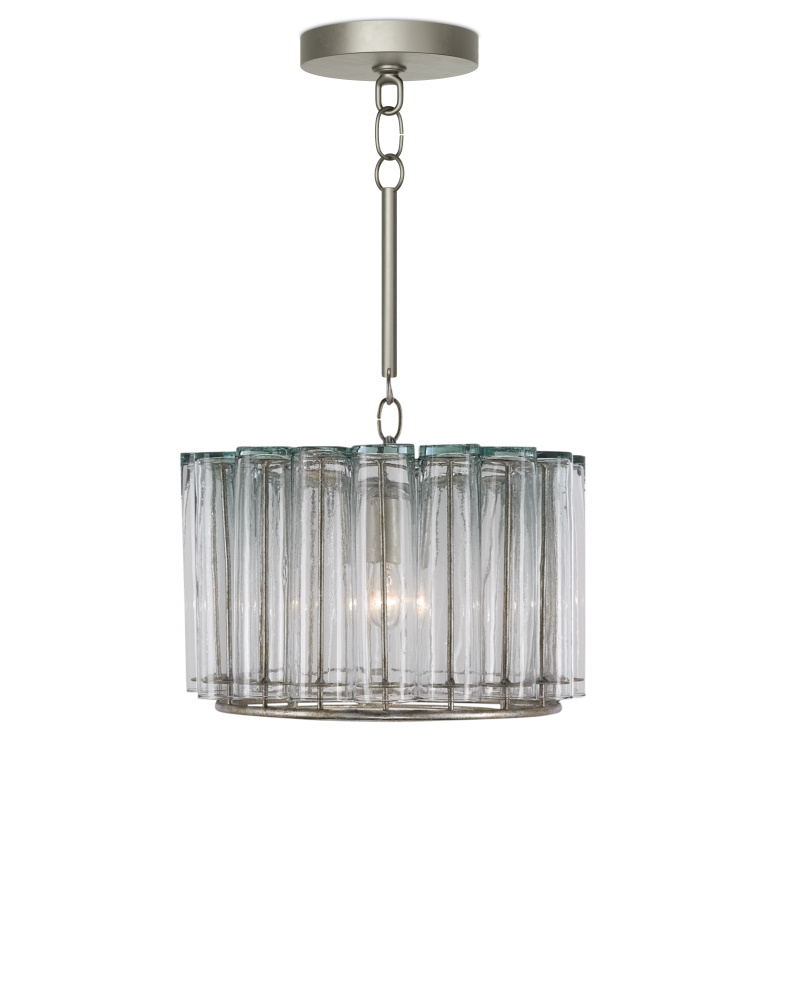 The Bevilacqua Pendant has reflective glass flutes made from recycled bud vases for a shade. Its wrought iron frame is finished in an exquisite silver leaf that compliments the hues in the recycled glass. This silver pendant is one in a variety of fixtures in the Bevilacqua collection. Adjustable from 16" to 82.5" with use of included chain/rod kit/cable. If your space calls for a longer drop, additional chain/rods/cable is available for purchase.