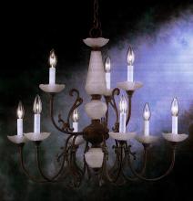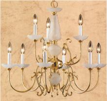 Bloomington 28"Wide x 28"Long x 25"High Lights: 9 x 60W candelabra Finish Shown: Verde/Polished Brass Crystal Shown: n/a Chain or Cable Length: 3 Ship Via: Parcel Shipping Weight: 17 Hanging Weight: 14 Catalog/Page Ref: Website The Bloomington series has a traditional look with simple, bent tubing arms complemented with cast scroll work and frosted glass column accents and bobeches.