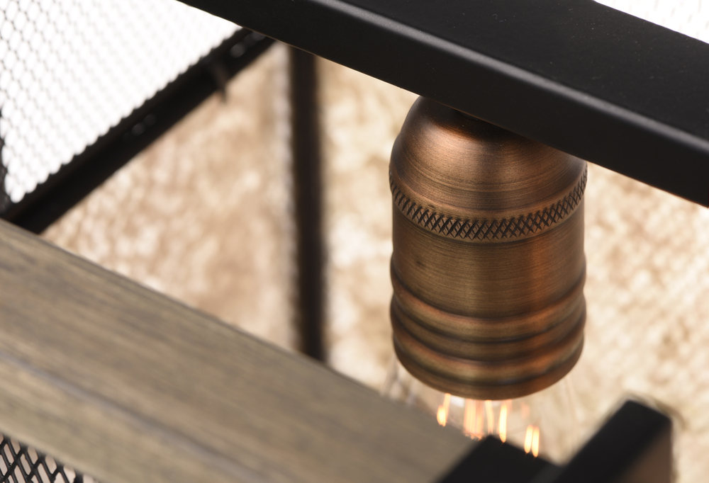 Frames of wood finished in Barn Wood and cradled by Black metal brackets were used to create this beautiful rustic design. The Black mesh screen is accented with a band of mica and Antique Brass sockets to deliver rustic charm with all the right fixings.