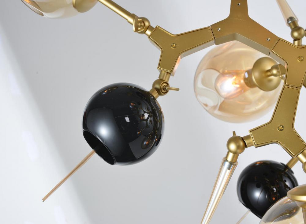 This modern ceiling fixture is in a gold finish. The frame is made out of aluminum, and it comes with globe black glass accents and glass shades in amber color.