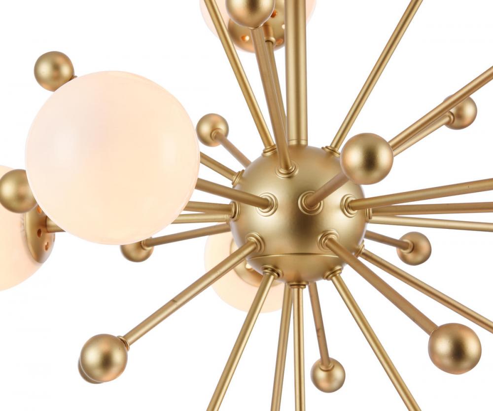 This exquisite ceiling fixture has a gold metal frame. It comes with glass global shades in white color. The adjustable rod link makes this fixture suitable for most ceiling heights.