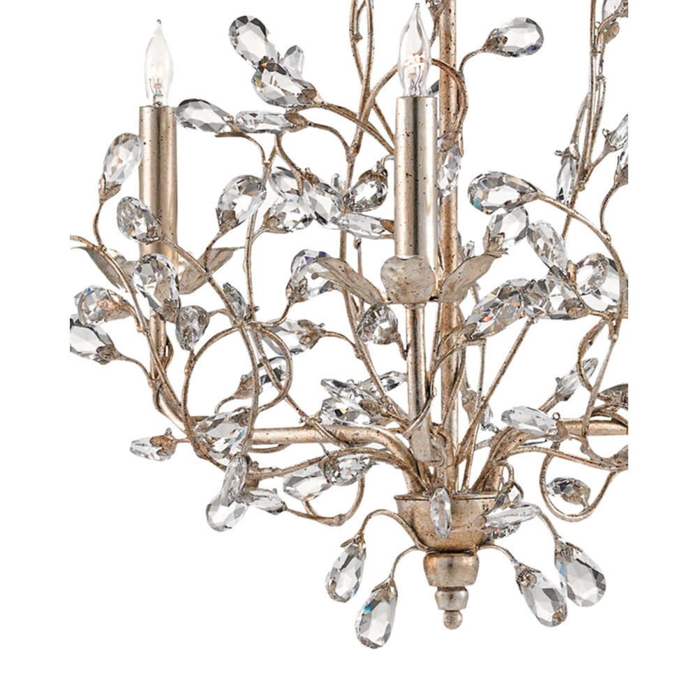 The pleasing attributes of nature merge with the conventions of finely crafted traditional design in the silver version of our romantic Crystal Bud Chandelier in a small size. Delicate faceted crystals unfurl from the silver Granello-finished vines that make up the flowing profile of this idyllic piece. The three-light chandelier is one of the fixtures in the Crystal Bud family of lights.