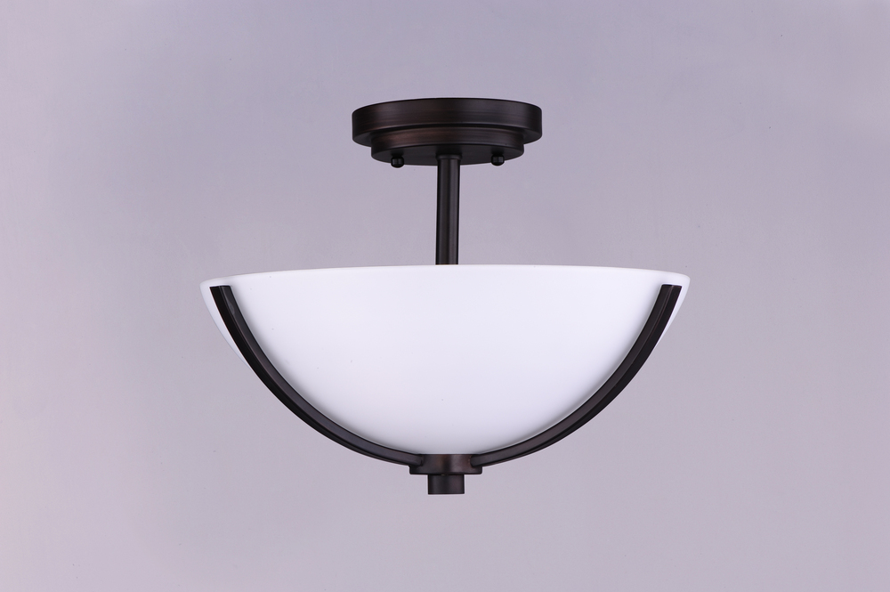 Low sloping arms of rectilinear tubing is finished in a variety of options that include Satin Nickel, Oil Rubbed Bronze, Matte Black, and a contemporary Satin Brass finish. Tall, cylindrical Satin White glass shades soften the light source within. Offered