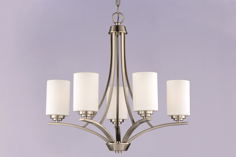 Low sloping arms of rectilinear tubing is finished in a variety of options that include Satin Nickel, Oil Rubbed Bronze, Matte Black, and a contemporary Satin Brass finish. Tall, cylindrical Satin White glass shades soften the light source within. Offered