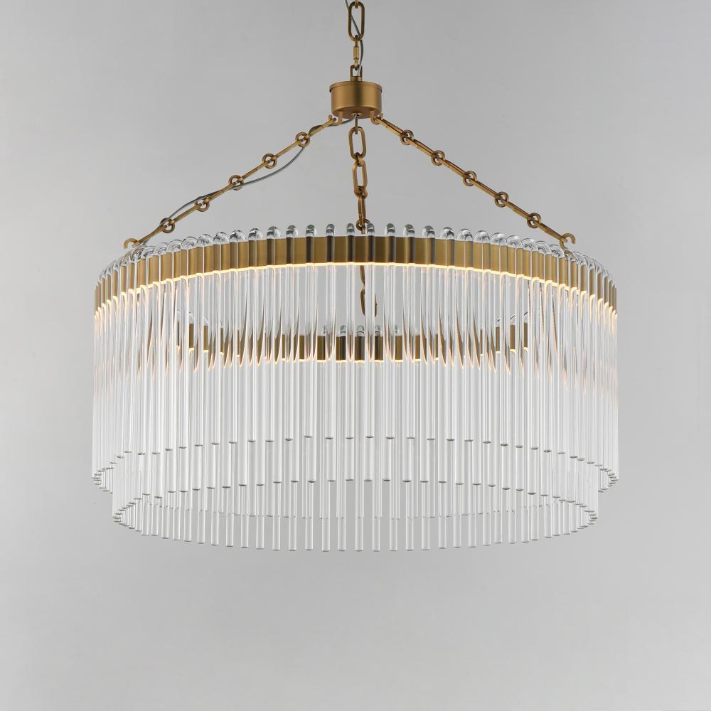 Clear glass rods elegantly curve to drape over a metal frame, encasing an integrated LED light source within. These ornamental glass rods form a luminous curtain, softly illuminated by the LEDs. The LED light source features an adjustable color temperature