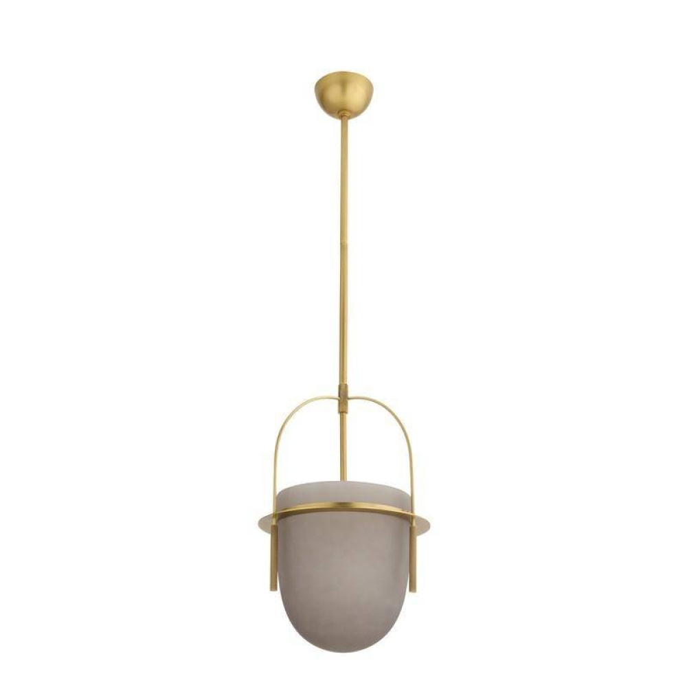 Neo-classically inspired, the Kathleen is a timeless bell jar fixture delivered in frosted smoke glass. Suspended from antique brass-plated steel with ridged details, the cup and pole design were inspired by counterweights. Finish will vary. Damp-rated, although limited, covered outdoor conditions may affect finish.