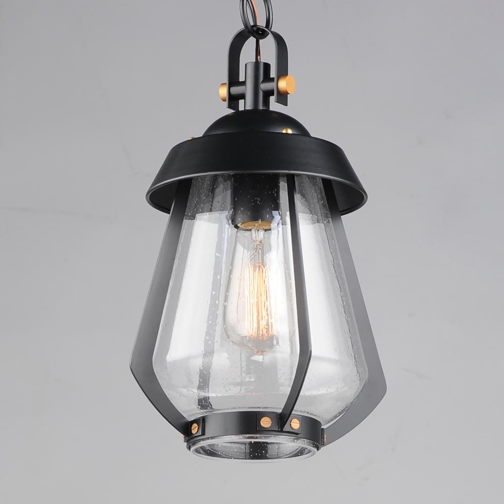 A nod to the nautical, the Marin outdoor sconces feature a two-tone frame of Black with Antique Brass details. Within the frame a pear shaped Clear Seeded glass shields a medium base lamp from the elements. Available in three sizes of sconce, two pendant c