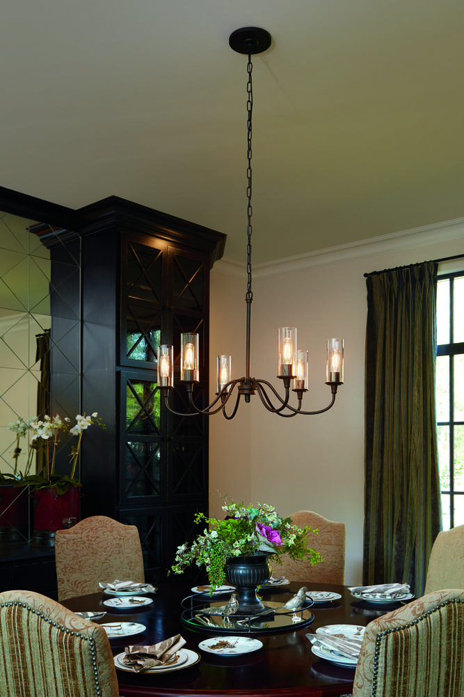The classic cylinder clear glass shades mirror the round backplates of the Modina collection by Craftmade. Dimmable LED filament bulbs are included.