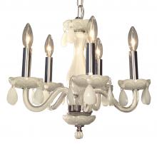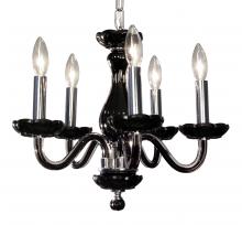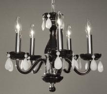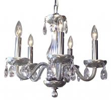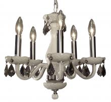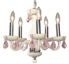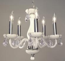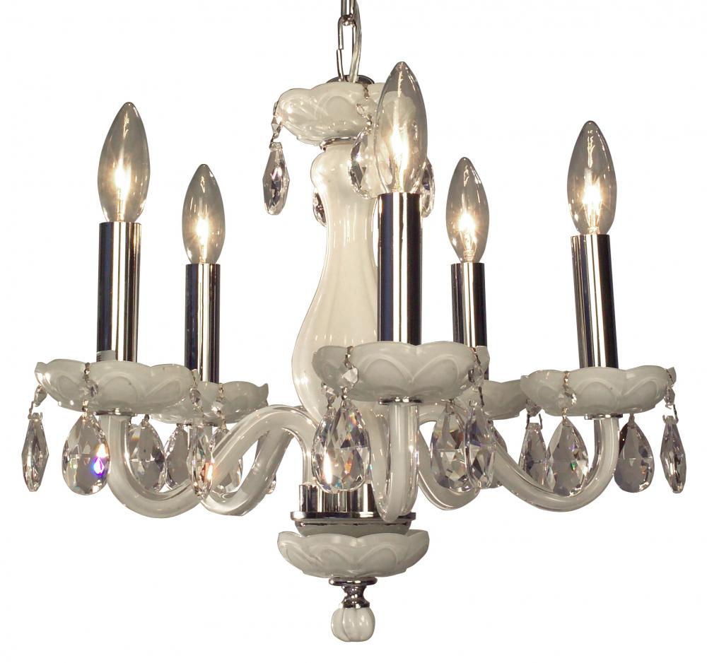 Monaco 17"Wide x 17"Long x 16"High Lights: 5 x 40W candelabra Finish Shown: White Crystal Shown: Crystalique-Plus Chain or Cable Length: 3 Ship Via: Parcel Shipping Weight: 16 Hanging Weight: 10 Catalog/Page Ref: 5410/14-16 The Monaco series are petite chandeliers having a simple elegance that will blend with most decors, but with eye-catching color options that POP. The lead crystal arms are coated on the inside with color to add a certain flare. Choose no crystal trim if the look desired is clean simplicity, or add colored crystal to slant the look toward traditional opulence. Frames are European-Made.