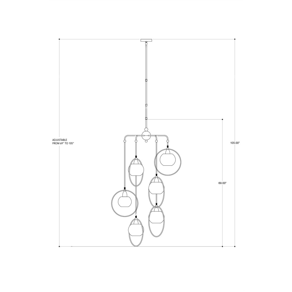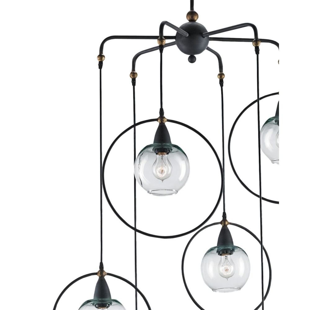 The Moorsgate Multi Pendant embodies mid-century modern style with its asymmetrical cascade. The circles of wrought iron surrounding the glass globes in a Blacksmith finish make this black pendant a lively contrast of materials. Adjustable from 69" to 105" with use of included chain/rod kit/cable. If your space calls for a longer drop, additional chain/rods/cable is available for purchase.
