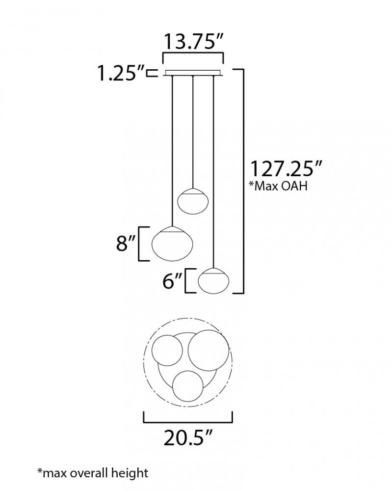 Oblong glass globe shades feature a intriguing Marble swirl pattern that obscures the integrated LED lighting within. Thin black electrical cords are easily adjustable. A larger oval 8-Light configuration features multiple sizes of the glass to create an i
