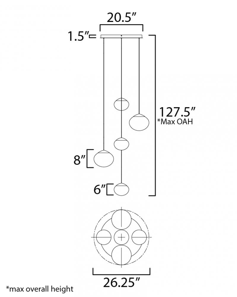 Oblong glass globe shades feature a intriguing Marble swirl pattern that obscures the integrated LED lighting within. Thin black electrical cords are easily adjustable. A larger oval 8-Light configuration features multiple sizes of the glass to create an i