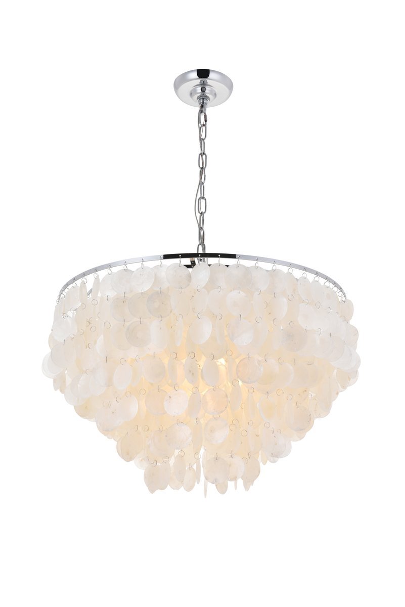 The gentleness of the Selene collection pendant lamp in a chrome finish elicits the calm temperament of the moon and the coy-- yet soothing, light it emits. Weaving through the myriad of the draped shell curtains, the illumination creates a new design every time, whether it is the shadows and highlights that changes with the direction of the light, just as the moon goes through its phases, or the shadows casted with every slight movement of the white shells. A wonderful addition to any home--foyer, living room, or a child's room.