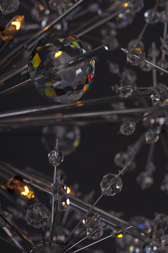Spectacular display of Beveled Crystal beads of various sizes which are mounted on sculptures Polished Chrome metal formations which will sure to be the focal point of your room. The high power Xenon bulbs add sparkle to the crystal while producing a natu