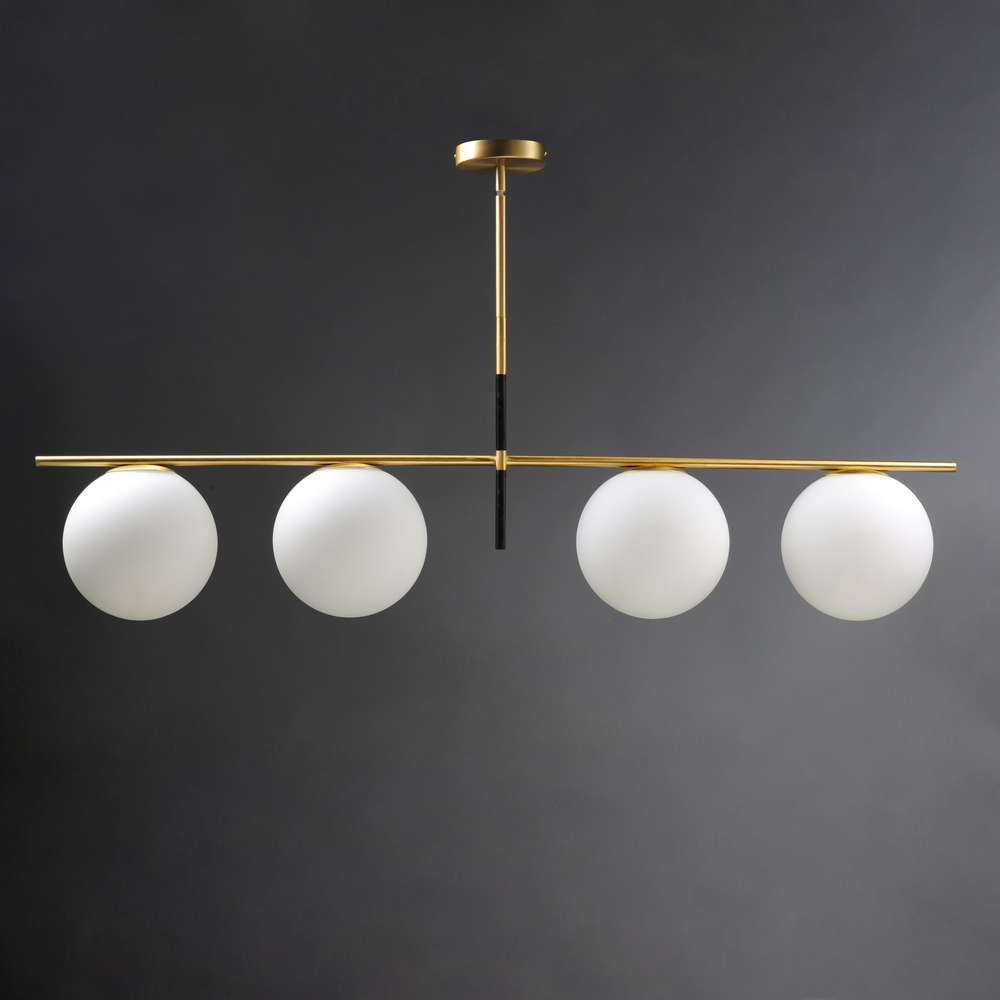 Inspired by both Mid Century Modern and Scandinavian Contemporary this collection spans a large breadth of today's interior design. Straight tubing finished in Satin Brass supports hand blown Satin White cased glass globes. Black accents of metal and B
