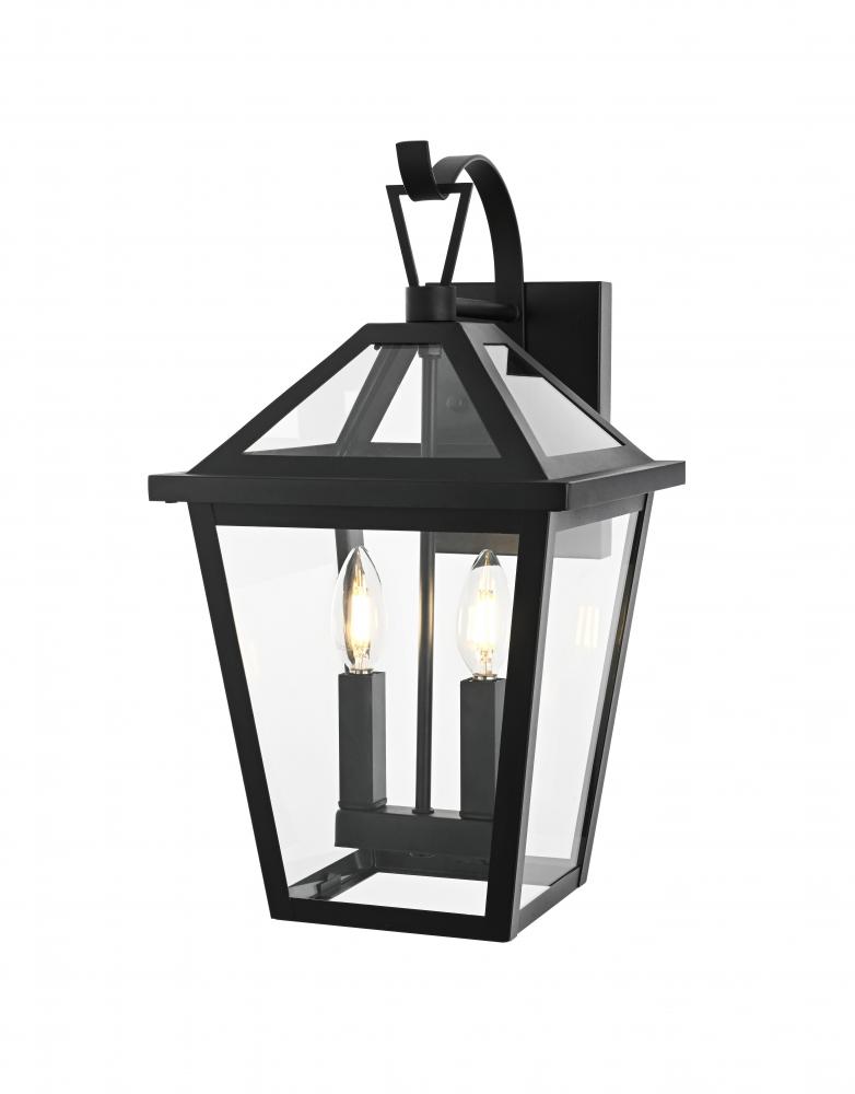 This outdoor wall sconce is a beautiful embodiment of modern and classic design that perfectly complements any exterior home setting. Constructed from sturdy iron and clear glass, the sconce combines sharp architectural lines with a timeless lantern style, resulting in a statement fixture that enhances curb appeal. The angular matte black frame, topped by a stylish triangular loop, embraces an open, trapezoid-shaped structure with clear glass panels that reveal two E12 candelabra sockets. These sockets provide the ideal opportunity to incorporate flame-shaped bulbs for a warm, welcoming ambiance. The open bottom design not only adds a touch of convenience for bulb replacement but also emphasizes the light's natural downward glow, making this sconce both practical and visually captivating. This piece is perfect for flanking a front door, lining a pathway, or accentuating any outdoor living area.