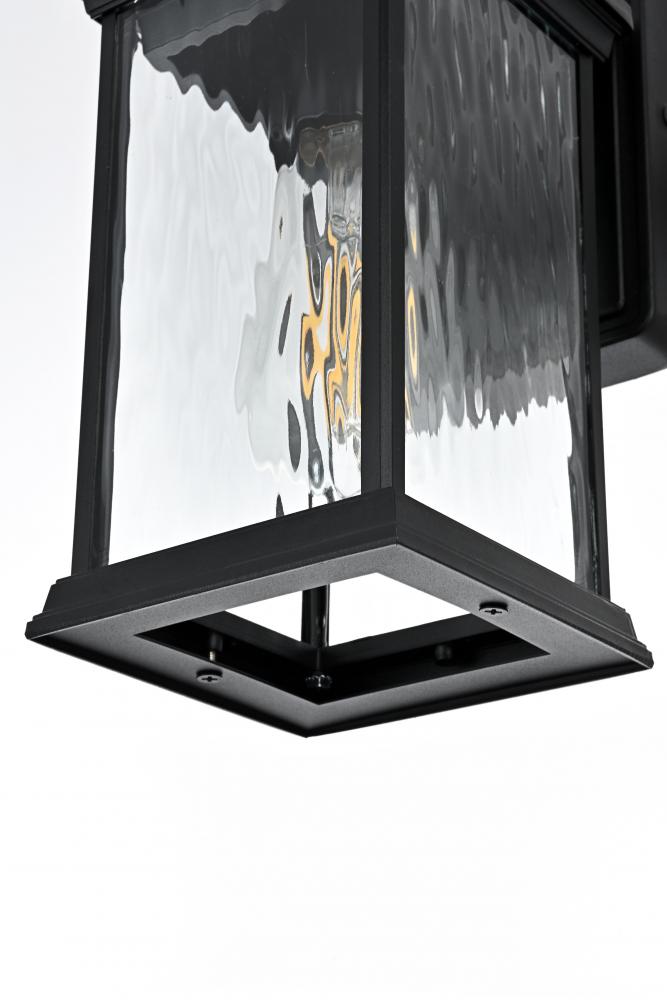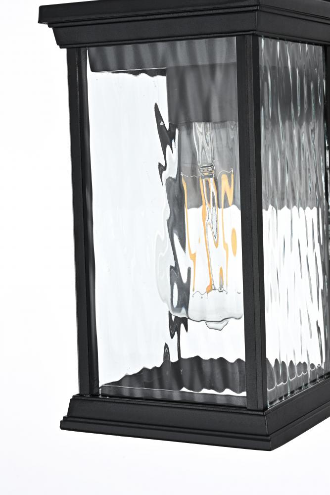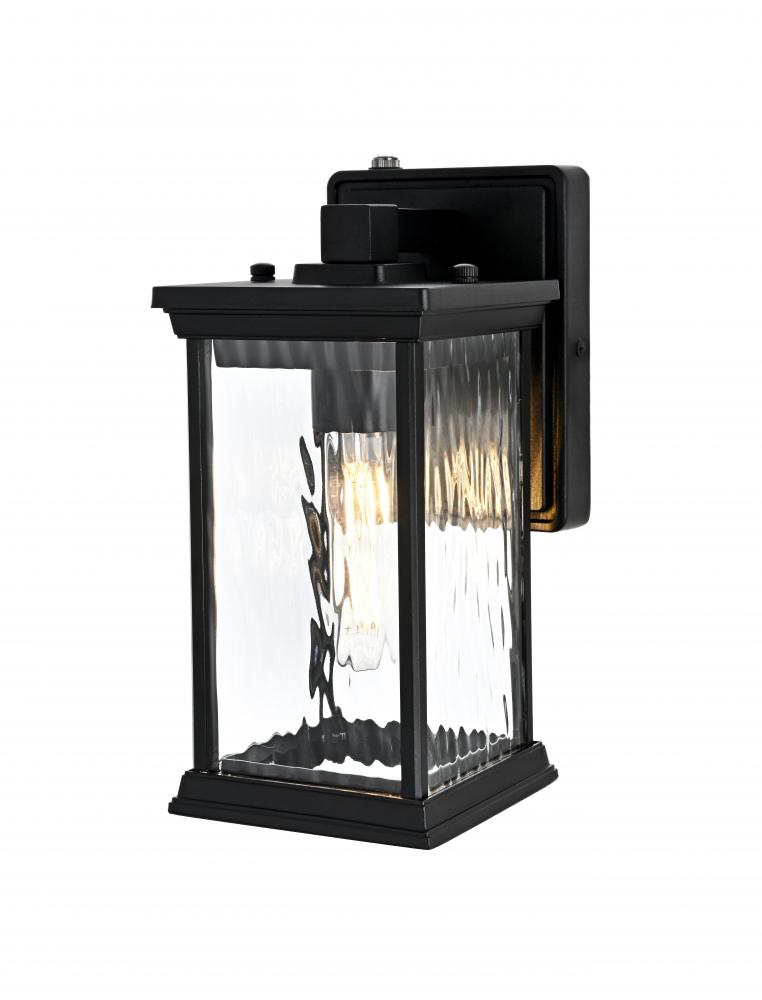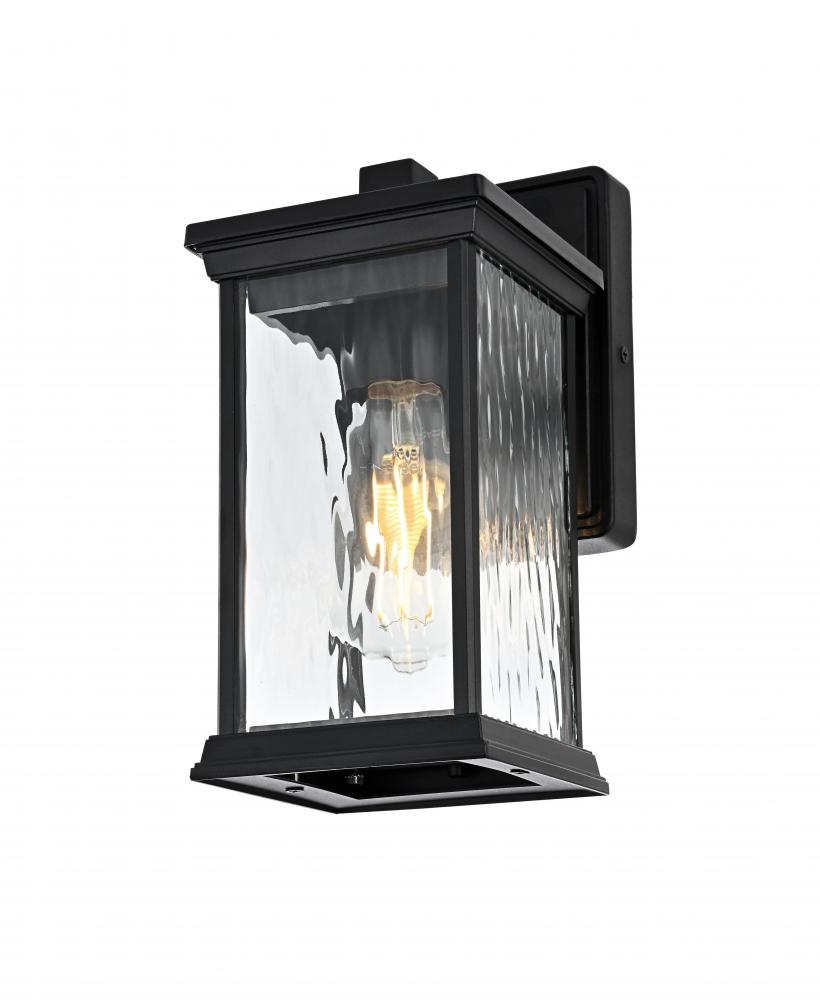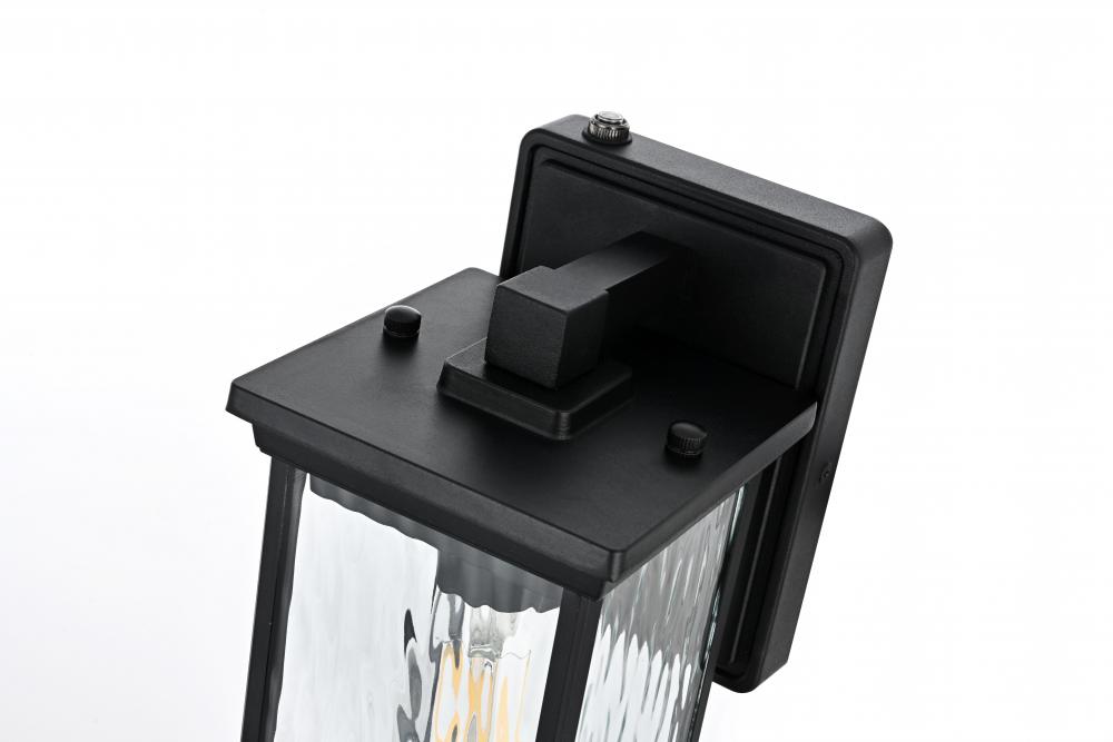 This outdoor wall sconce brings an instant touch of sophistication to your exterior décor. Crafted with an aluminum frame, the design features a distinctive rectangular shape with slightly flared accents at the top and bottom for added visual interest. The rippled glass panels enclose an E26 socket, designed to accommodate a traditional Edison-style bulb, which casts a warm and inviting glow. The combination of a sturdy aluminum frame and the rippled glass texture creates a timeless aesthetic, perfect for creating a cozy ambiance on porches, entryways, or patios. Its matte black finish ensures this wall sconce can seamlessly blend into modern, farmhouse, or transitional styled homes, while the durable construction ensures that it stands the test of weather and time.