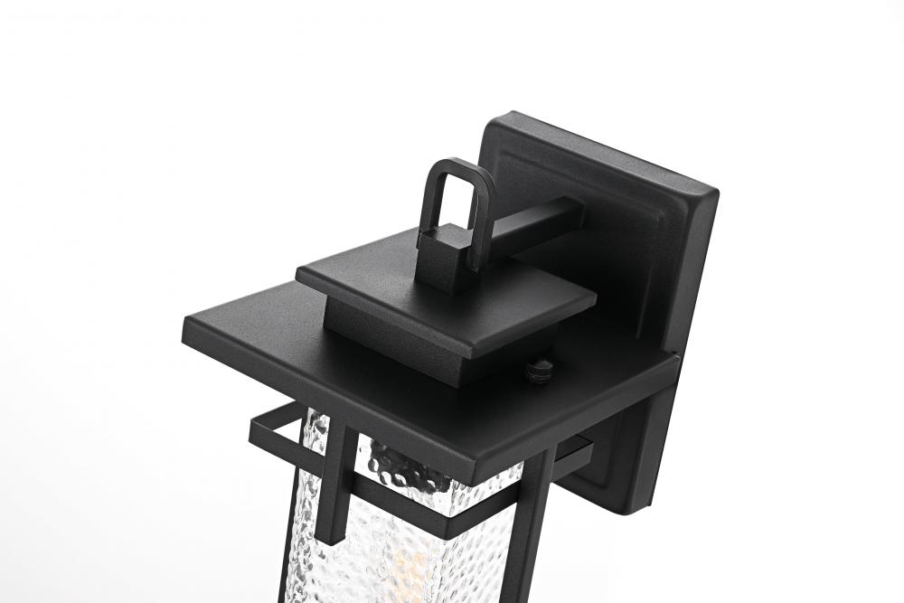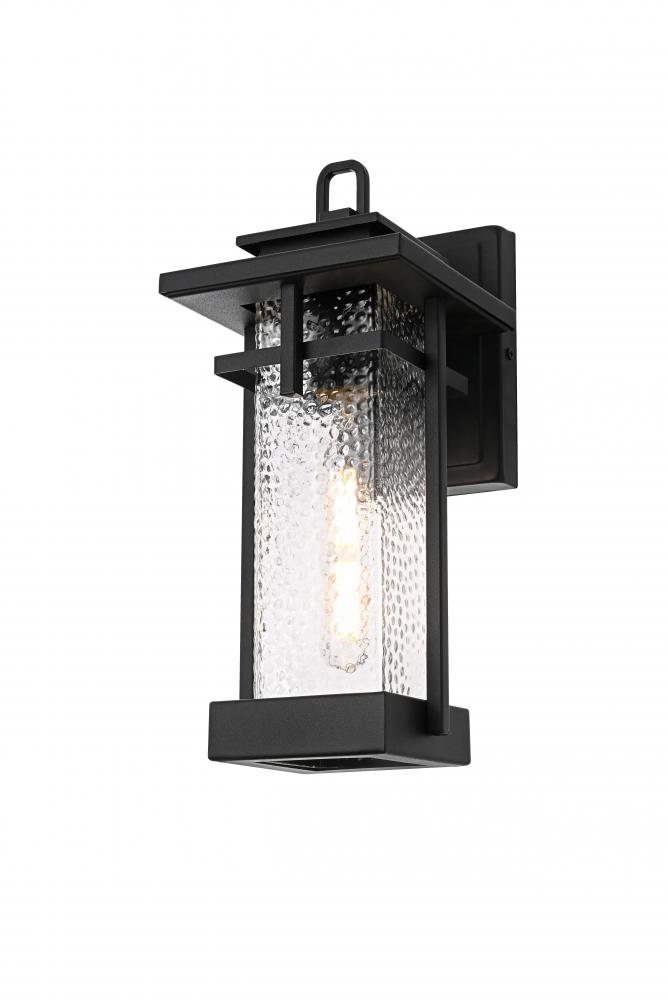 This outdoor wall sconce embodies a timeless design that adds an upscale touch to any exterior space. Crafted from durable iron and clear hammered glass, it effortlessly merges aesthetics and practicality. The hammered glass creates a warm and inviting glow, making it perfect for lighting pathways, porches, or garden areas. The E26 socket base allows for versatility in bulb selection to create the ambiance of your choice, and the sconce is designed to withstand weather exposure, ensuring long-lasting performance. The top roof cap design adds a classic accent while enhancing light direction, making it both stylish and functional for any home exterior.