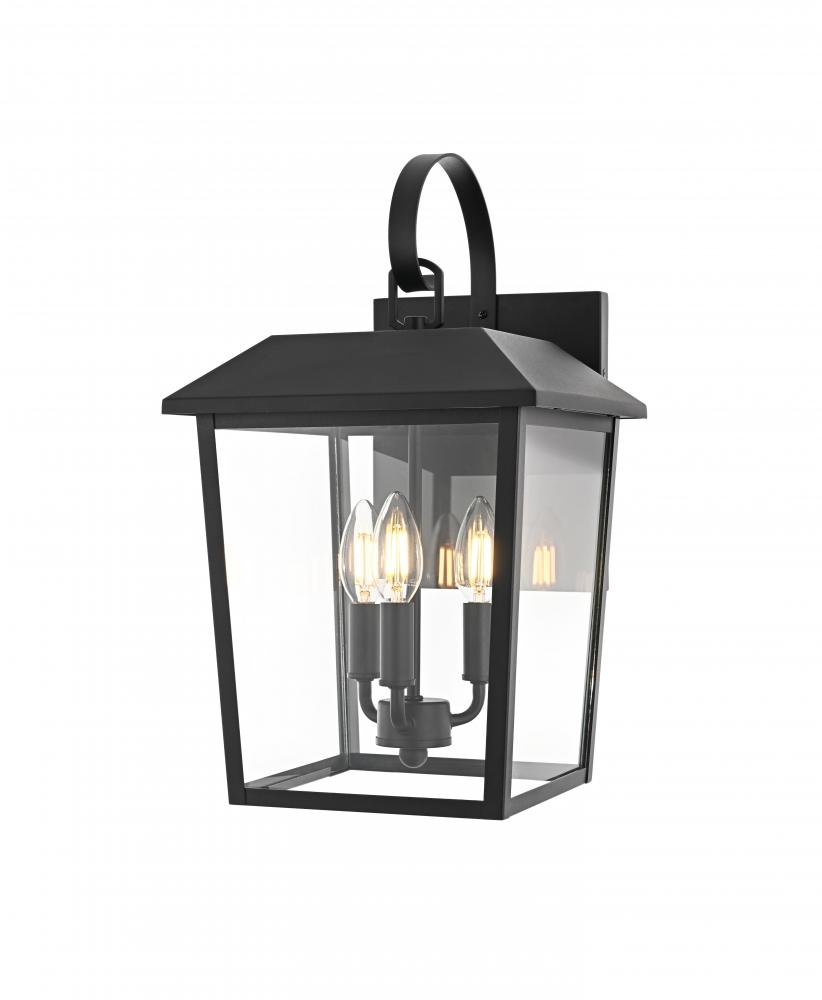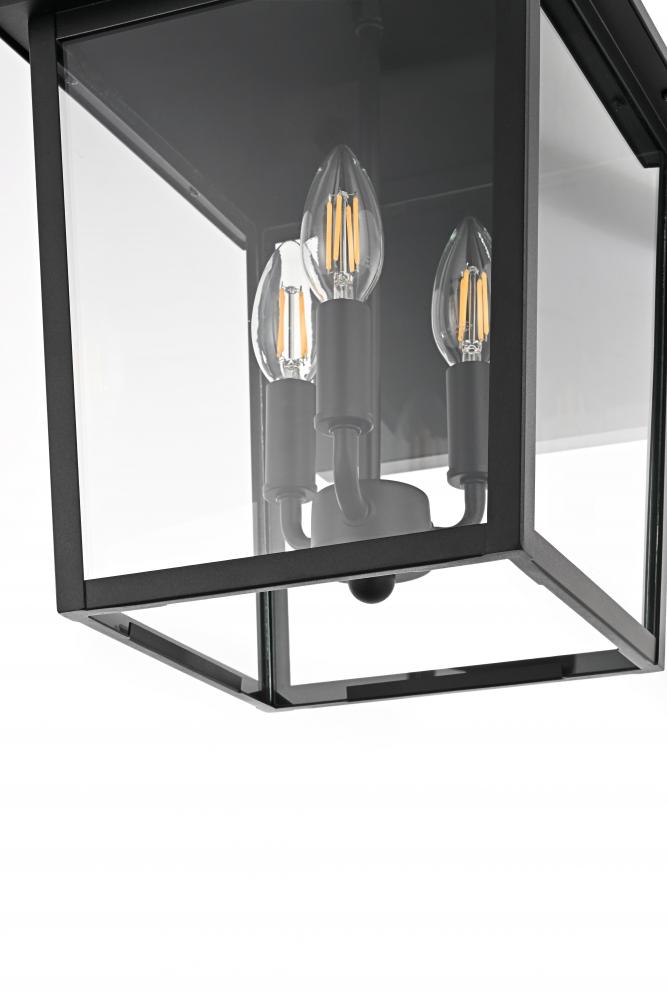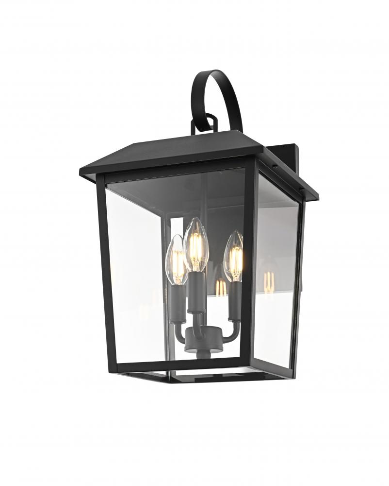 Enhance your home’s curb appeal with this striking outdoor wall sconce. Crafted from sturdy iron and framed with crystal-clear glass, this sconce embodies a bold rectangular lantern design that radiates classic charm. with three candelabra-style bulbs, it casts a warm, inviting glow, beautifully amplified by the clear glass panels. The matte black finish and curved arm detail add a touch of architectural refinement, while its weather-resistant design ensures lasting beauty. Perfect for entrances, patios, or walkways, this sconce lights the way in style.