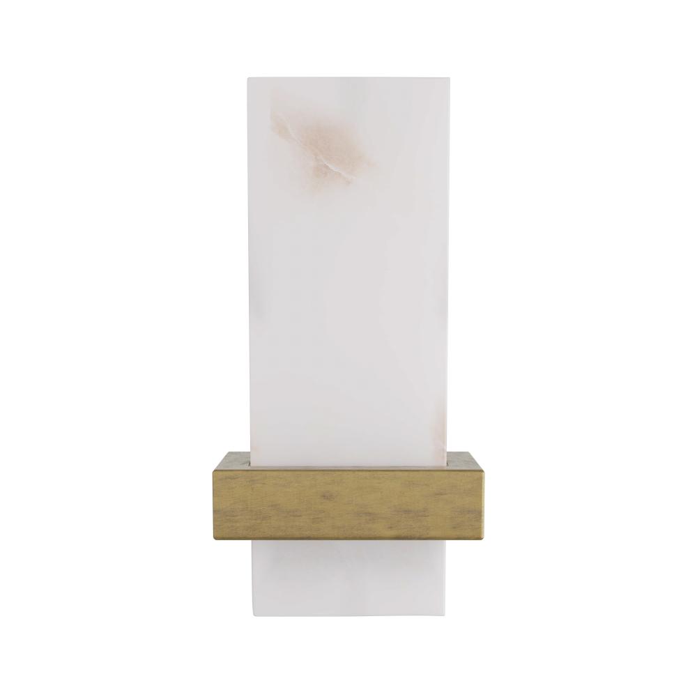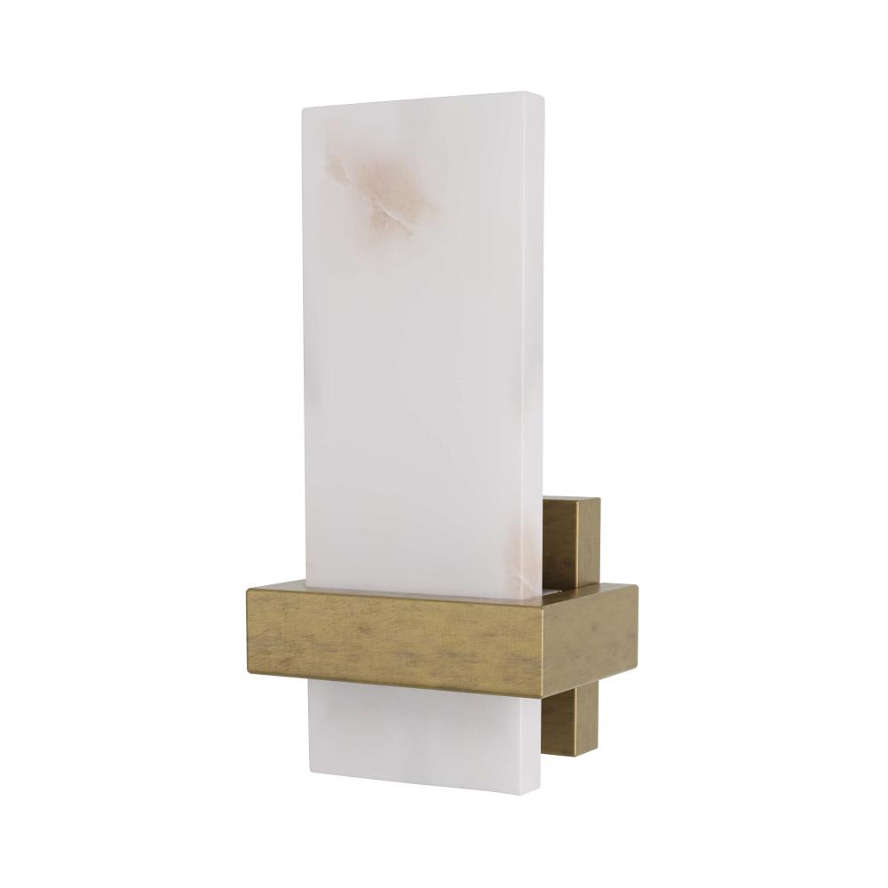 A GORGEOUS, WHITE ALABASTER DIFFUSER PLATE CREATES WARM FILTERED LIGHT AND ADDS NATURAL SOPHISTICATION TO ANY SPACE. THE BULB BEHIND ACCENTUATES THE STONE’S ORGANIC VEINS AND FEATURES BRILLIANTLY AS IT RESTS PERFECTLY WITHIN THE ANTIQUE BRASS IRON FRAME. THE LED FIXTURE MOUNTS DIRECTLY FROM ITS STEEL FRAME, FINISHED IN ANTIQUE BRASS. FINISH WILL VARY. DAMP-RATED, ALTHOUGH LIMITED COVERED OUTDOOR CONDITIONS MAY AFFECT FINISH.